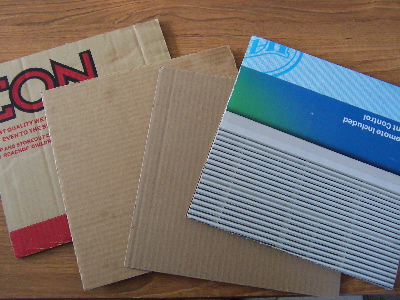 Next you will need some heavy, corrugated cardboard squares. They should be cut so that they are the same size as the records you are mailing (i.e., if you are mailing 10-inch records, cut the cardboard squares so that they are 10 inches on each side). If you will be mailing many 78s, you may want to consider buying a carton of pre-cut squares (available from Bags Unlimited). If you are only mailing a few records or if you are on a budget, you can cut your own squares from old boxes. Just be sure they are heavy corrugated cardboard, NOT the flimsy stuff! |