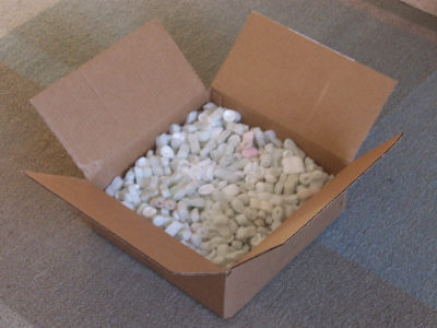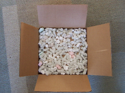 Now find a sturdy box that is large enough to accomodate your record sandwich lying flat (with plenty of room to spare) and begin filling it with packing peanuts or crumpled newspaper. |
