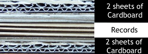 Now comes the most critical part. Since 78 rpm records are very brittle, they won't survive any bending or uneven pressure. To brace the records so that they won't be bent in shipping, we make a "record sandwich." For the base of the sandwich, place two of the cardboard squares with the corrugations running in opposite directions. Then place a stack of up to ten records on the base (no more than 10 records per sandwich!). Finally, place two more cardboard squares on top, again with the corrugations running in opposite directions. |