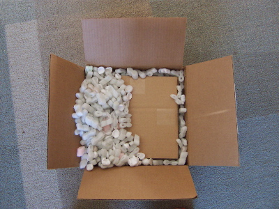 Now find a sturdy box that is large enough to accomodate your record sandwich lying flat (with plenty of room to spare) and begin filling it with packing peanuts or crumpled newspaper. |